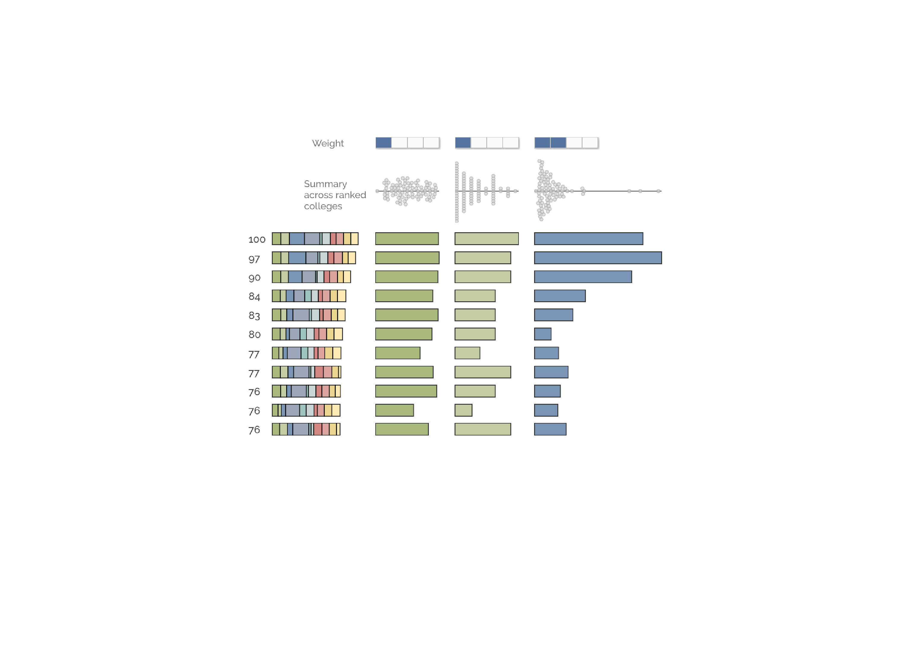 This visualization ranks colleges across a number of hetergeneous features, allowing for in-depth comparisons beyone opaque college rankings.